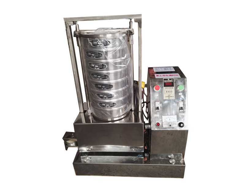 拍擊式振動篩是通過振動電機帶動齒輪通過同步帶傳動到主軸上,經齒輪變速后主軸按要求的轉速轉動,主軸帶動偏心輪使滑板做往復運動,帶動安裝在滑板托盤中的網孔從大到小的兩組試驗篩左右搖動,同時主軸帶動頂桿齒輪轉動,變速后頂桿齒輪通過凸輪頂擊頂桿,頂桿使拍錘上下拍擊試驗篩上蓋,使得試驗篩、分樣篩中的物料往復和上下振動,使小于試驗篩篩面網孔的物料顆粒篩分進下層試驗篩,如此層層篩選,使每層試驗篩內只留相同粒度的物料。達到不同粒度的分離并確定此物料的粒度組成。